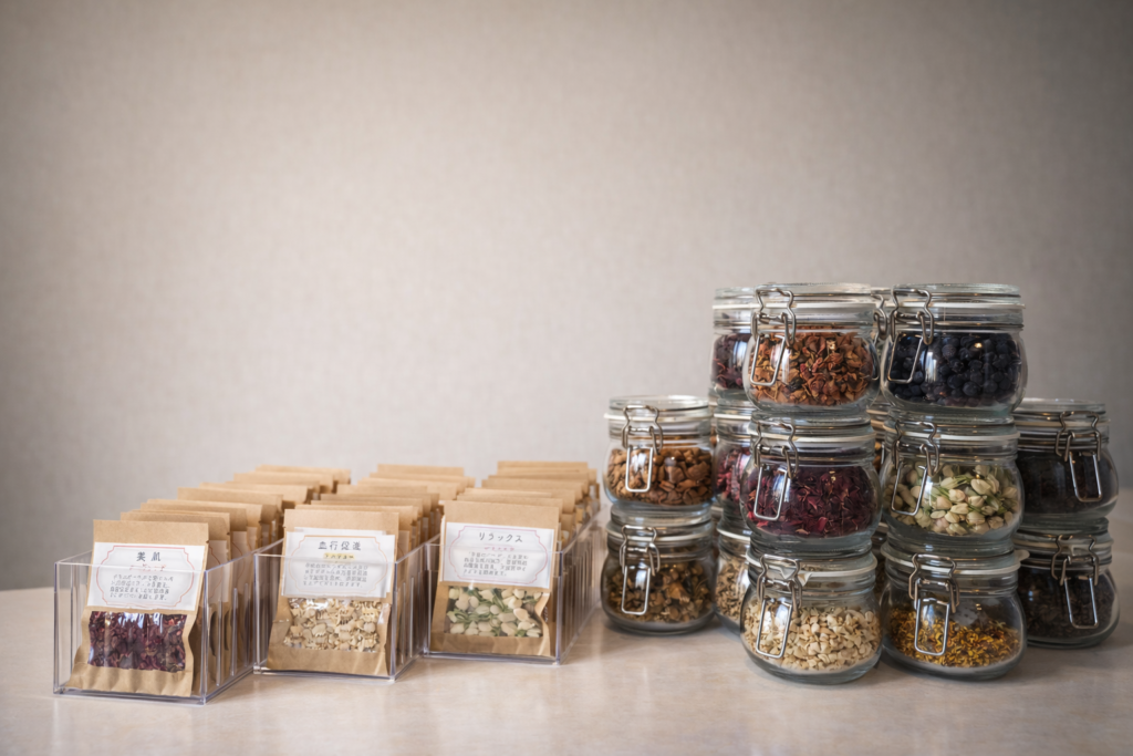 たくさんの種類のハーブを見比べて、嗅ぎ比べて、自分好みにブレンドできるチャンス!