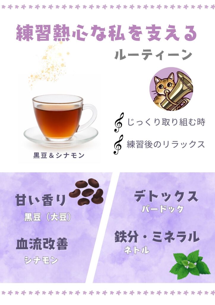 「練習に入る前のハーブティー」「本番前のハーブティー」と脳が覚えることで、心と体が整う“スイッチ”にすることができると考えています。