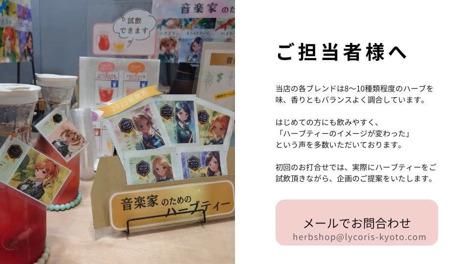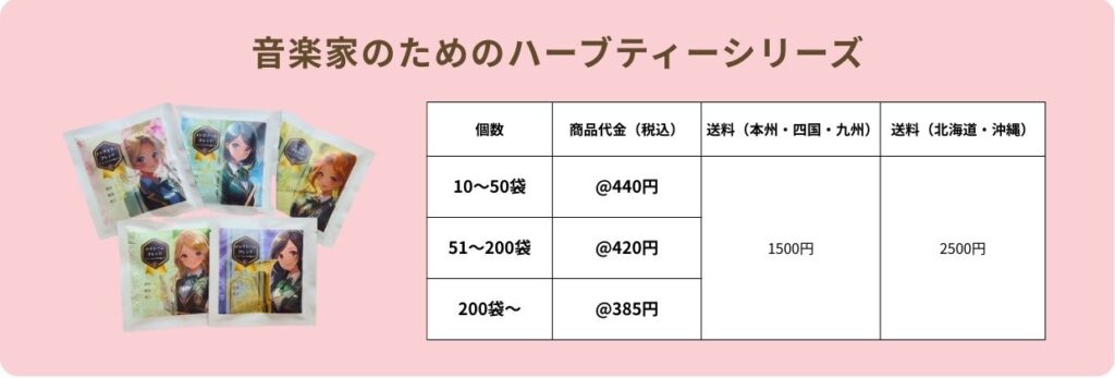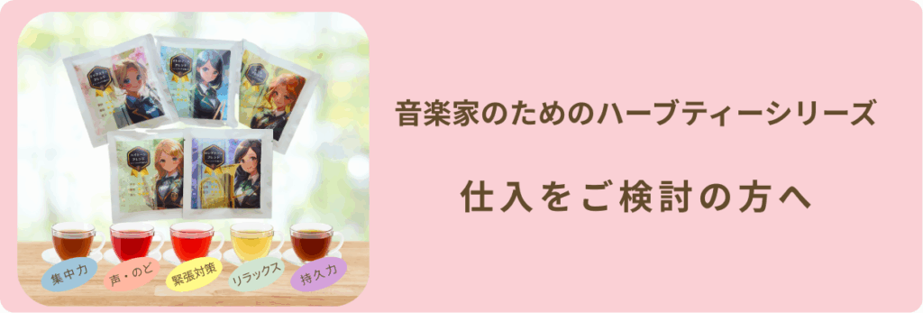 「音楽家のためのハーブティー」シリーズの卸販売は、10袋以上で随時発送いたします。10袋の種類、内容は問いません。在庫に合わせてお好きな組み合わせでご発注ください。※賞味期限6カ月以上の商品となります※在庫がある場合、お振込確認後2日以内に発送※初回の方に限り、各1袋ずつサンプル発送いたします(無料)